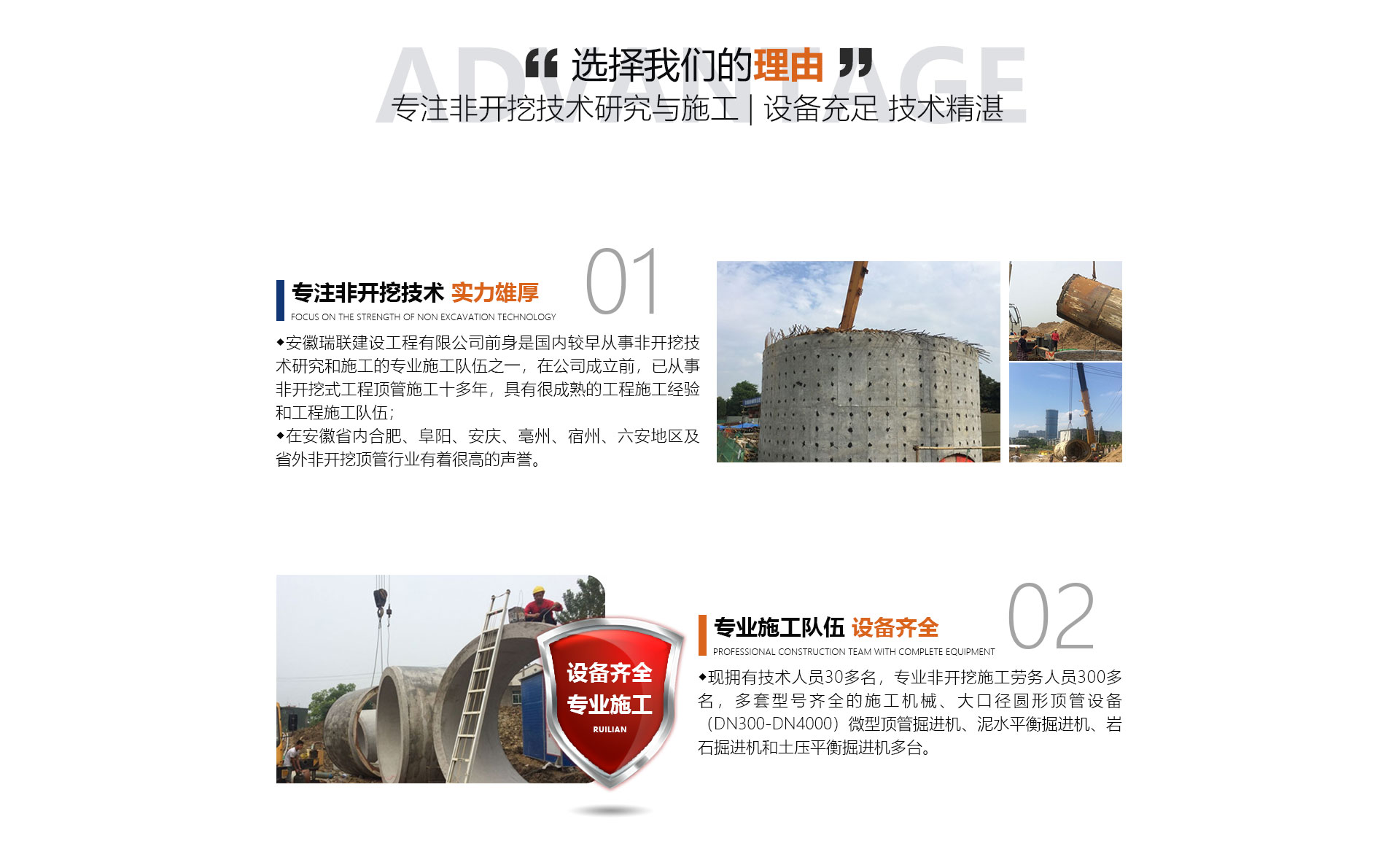安徽瑞聯建設工程有限公司前身是國內較早從事非開挖技術研究和施工的施工隊伍之一,在公司成立前,已從事非開挖式工程頂管施工十多年,具有很成熟的工程施工經驗和工程施工隊伍,在安徽省內合肥、阜陽、安慶、亳州、宿州、六安地區(qū)及省外非開挖頂管行業(yè)有著很高的聲譽。面對日益擴大的市場,公司于2014年正式成立,公司擁有勞務分包及市政公用工程總承包資質。公司優(yōu)勢(文字):現擁有中高技術人員30多名,非開挖施工勞務人員300...